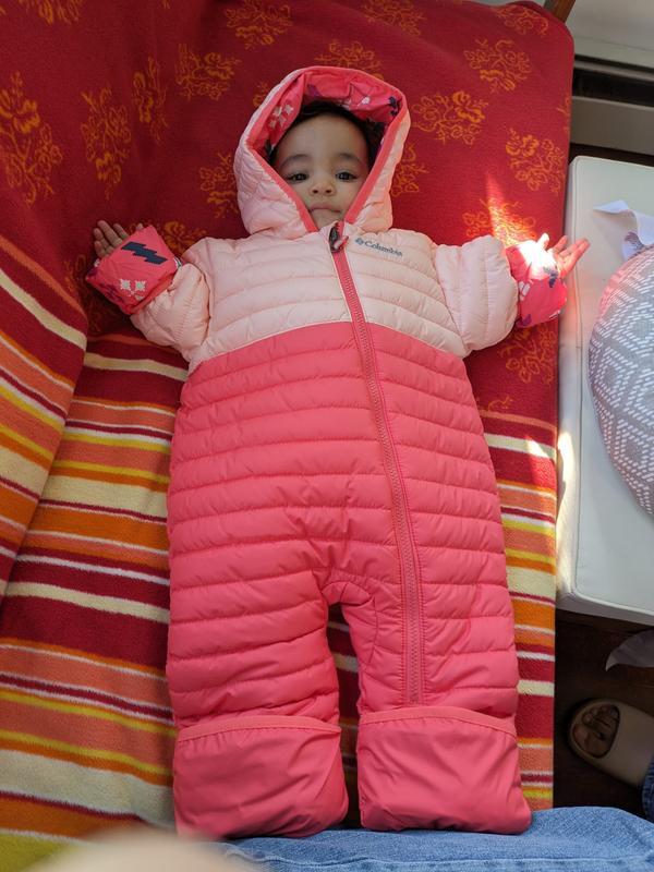 [This review was collected as part of a promotion.] Purchased the size 12-18 mo for my 8 month old in September- it’s huge now but it will definitely last through the spring in the PNW. Love the lightweight puffy and the colors look great. Love the hand and foot covers.