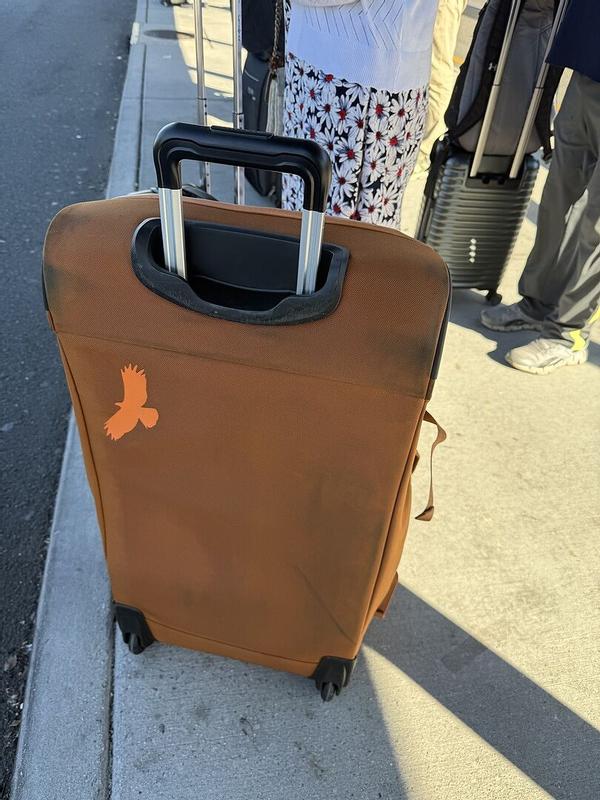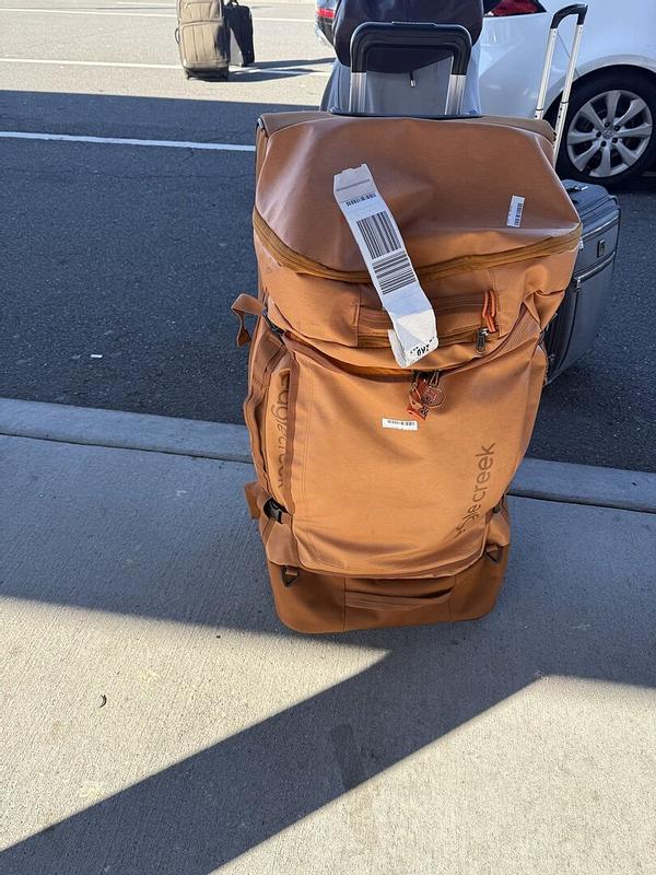 I have 4 eagle creek bags. This luggage I bought to replace my duffel That had no rigid back and was difficult to pull when it wasn’t fully packed. This bag stands up on its end, has a pull handle, looked good. After one airport trip it changed colors from orange to grey-orange. It sort of absorbed all the dirt in the plane and baggage system. On my first flight the copa air line made me sign a bag damage waiver due to the material. Well they must have known the material. I’m hoping to hear back from eagle creek with some resolve on a brand new bag.