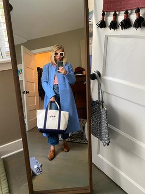 This tote size is my new favorite. Easy to get things in and out of and the long handle makes it comfortable to carry. The bag looks great on. You will want it in multiple colorways, its an addiction.