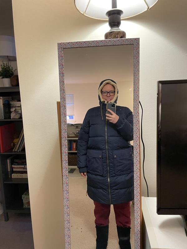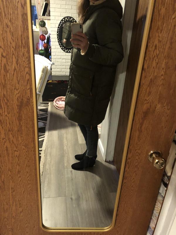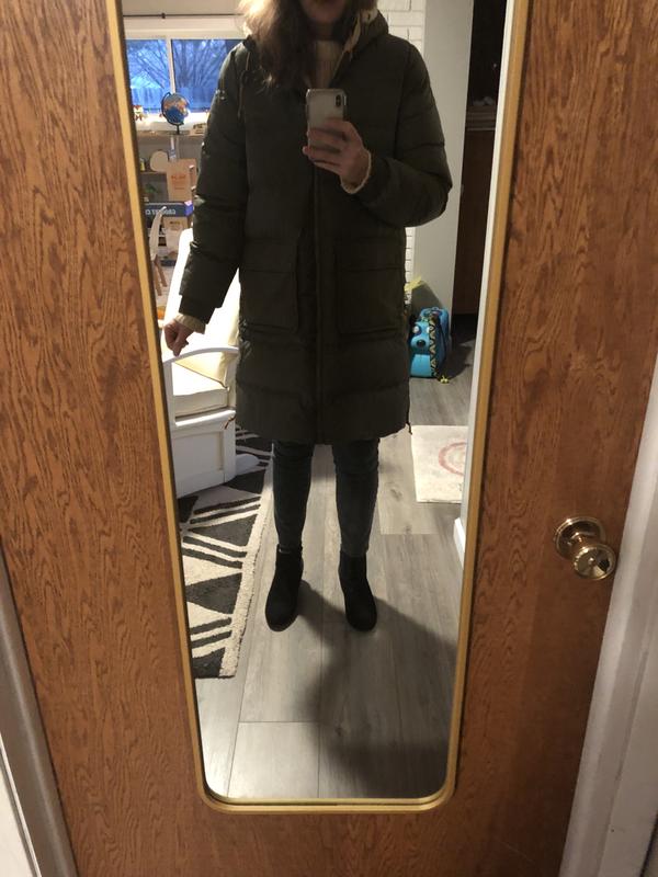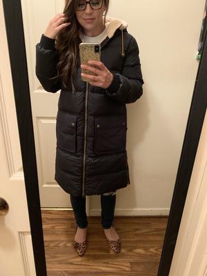 This is the perfect winter coat. So warm and I think it’s super flattering. I wear it around in temps between 0-40 and it’s very warm. Oversized perfectly to allow layering. 5’0, 100 lb, XS regular because petite was out of stock and it fits great