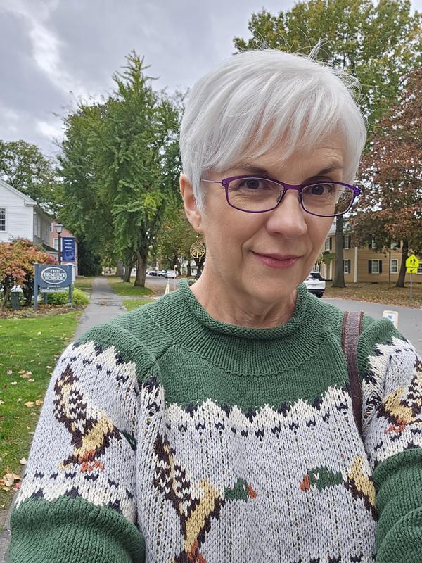 I bought the navy check design and I love this sweater. It's pretty, completely made of organic cotton (my favored material), and fits perfectly. It's heavy and warm. I also love the neck--covers my neck without choking me. I'm 5'4" and the medium length is excellent--not too short.