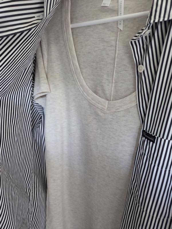 [This review was collected as part of a promotion.] Nice ribbed material that isn’t see though and has some weight to it. Great neutral color and t e shirt style with the round neck fits perfectly!!!
